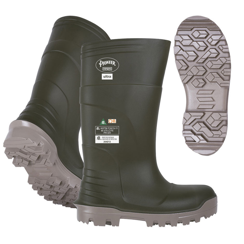 Pioneer Ranpro V4240140 Ultra -50°C Composite Toe/Plate PU Boot. Size 6-15. Composite toe and non-metallic midsole provides full safety protection and increased thermal insulation in cold weather. Omega/EH rated. Winter tire inspired tread pattern features wider and deeper dispersion lines designed to pull water up and away from the contact point between the sole and ground for greater slip resistance. Aggressive tread design to provide superior traction in snow and mud. Reinforced ankle protection and extra ankle room to prevent rubbing.