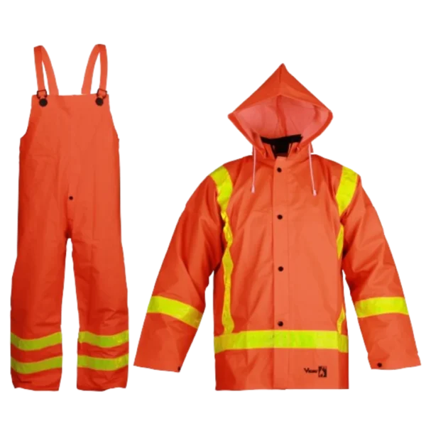 Fully compliant with CSA Z96-09 Class 1, Level FR .Tested in accordance with test method CAN/CGSB-4.2 No.27.10 & ASTM D6413 flame resistance, self extinguishing for momentary contact with open flame. 0.35mm FR treated PVC/Polyester /PVC material. 2" Yellow Prism Reflective Tape. Generous sizing for comfort and freedom of movement. Welded seams for durability and waterproofness. ESR nylon snap closure systems. Jacket features cotton corduroy collar on jacket. Removable hood included. Bib Pant features adjustable waist panel and ESR suspenders.