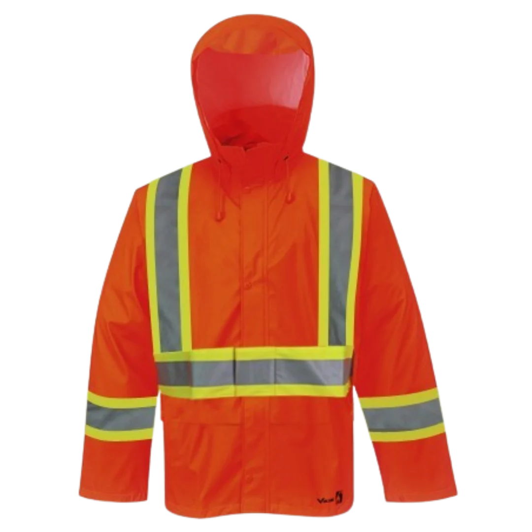 Viking 6055FRJO Flame Retardant 3M Orange PU Rainsuit Jacket. Available in sizes SM-4XL. Fully compliant with CSA Z96-09: Orange, Class 1; Green, Class 2 Level FR.Tested in accordance with test method CAN/CGSB-4.2 No.27.10 & ASTM D6413. Stretchable FR treated PU/Polyester fabric lightweight and flexible in sub-zero conditions.2" 3M Scotchlite reflective Material in 4" contrasting tape meets WCB/Worksafe/DOT configuration and micro welded seams.Resistant to motor oil, diesel, chemicals, animal fats and fish oils. ESR nylon snap closure systems. Jacket features large detachable hood to cover hard hat. Adjustable wrist cuffs. Underarm vents. Two durable integrated front pockets.