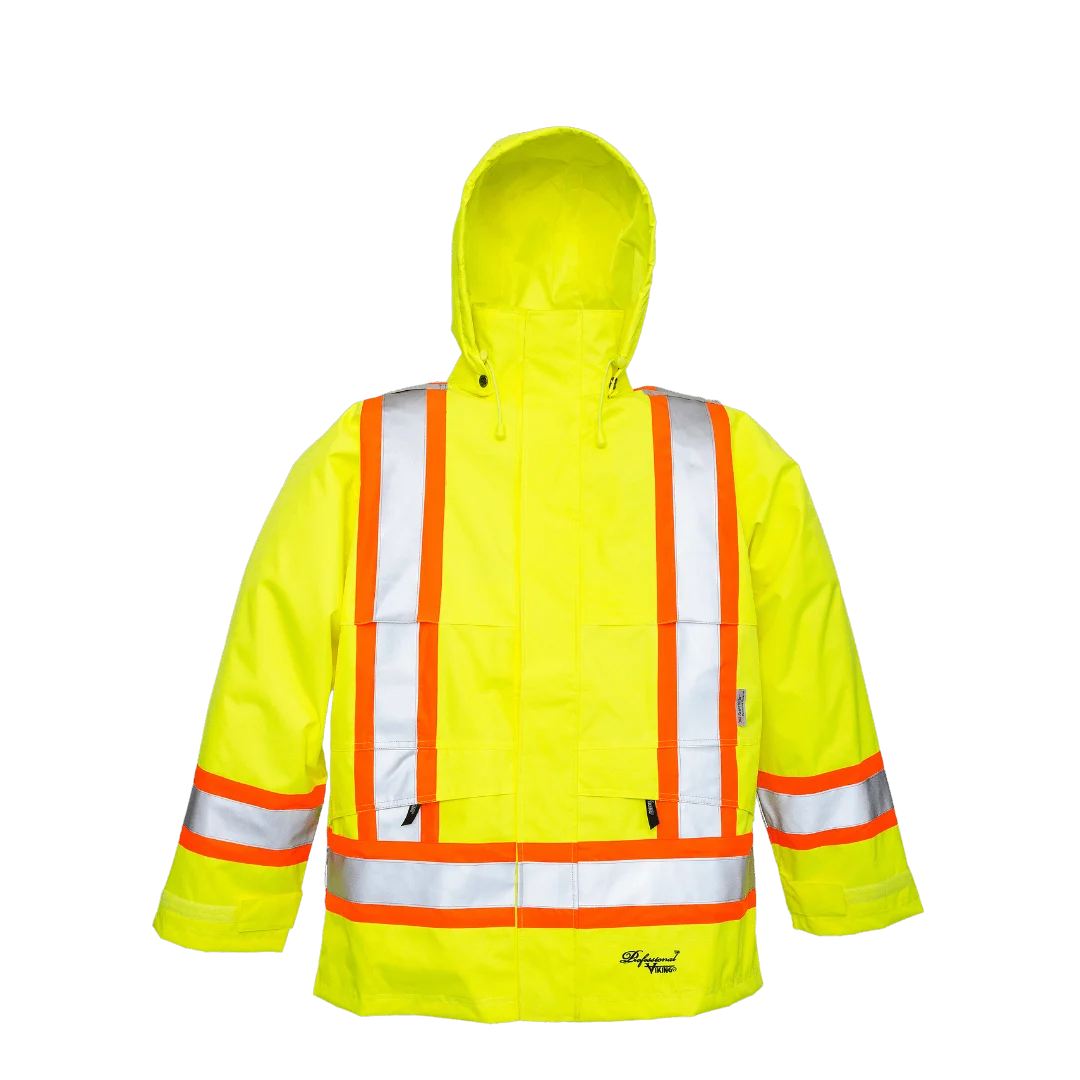 This Traffic Safety Parka is designed with H.D.300 Denier Polyester/PVC material. Fully compliant with CSA Z96-02 Class 2, Level 2. Becomes CSA Class 3 when worn with Bib Pants. Fully compliant with ANSI/ISEA 107-2004 Class 3, Level 2. Features 2 inch 3M Scotch lite Reflective Material in 4 inch WCB/DOT configuration on parka shell and inner vest. Parka material is highly resistant to abrasion, punctures, rips and snags and is flexible in sub-zero conditions. Comes with arm pit zips which provide breath-ability, two front pockets and chest cell pocket. Hood #6330HO, 6330HG - sold separately. Hi-Viz Lime Green Parka.