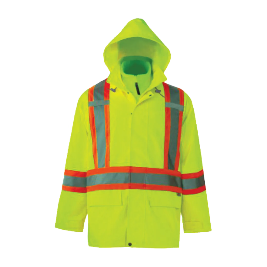 This 3-n-1 all season Traffic Safety Parka is designed with H.D. 300 Denier Polyester/PVC material & 260 gsm premium Polyester inner hooded safety fleece jacket. Fully compliant with CSA Z96-02 Class 2, Level 2. Becomes CSA Class 3 when worn with Bib Pants. Fully compliant with ANSI/ISEA 107-2004 Class 3, Level 2. Features 2 inch 3M Scotch lite Reflective Material in 4 inch WCB/DOT configuration on parka shell and inner vest. Parka material is highly resistant to abrasion, punctures, rips and snags and is flexible in sub-zero conditions. Comes with arm pit zips which provide breath-ability, two front pockets and chest cell pocket. Hood #6330HO, 6330HG - sold separately.