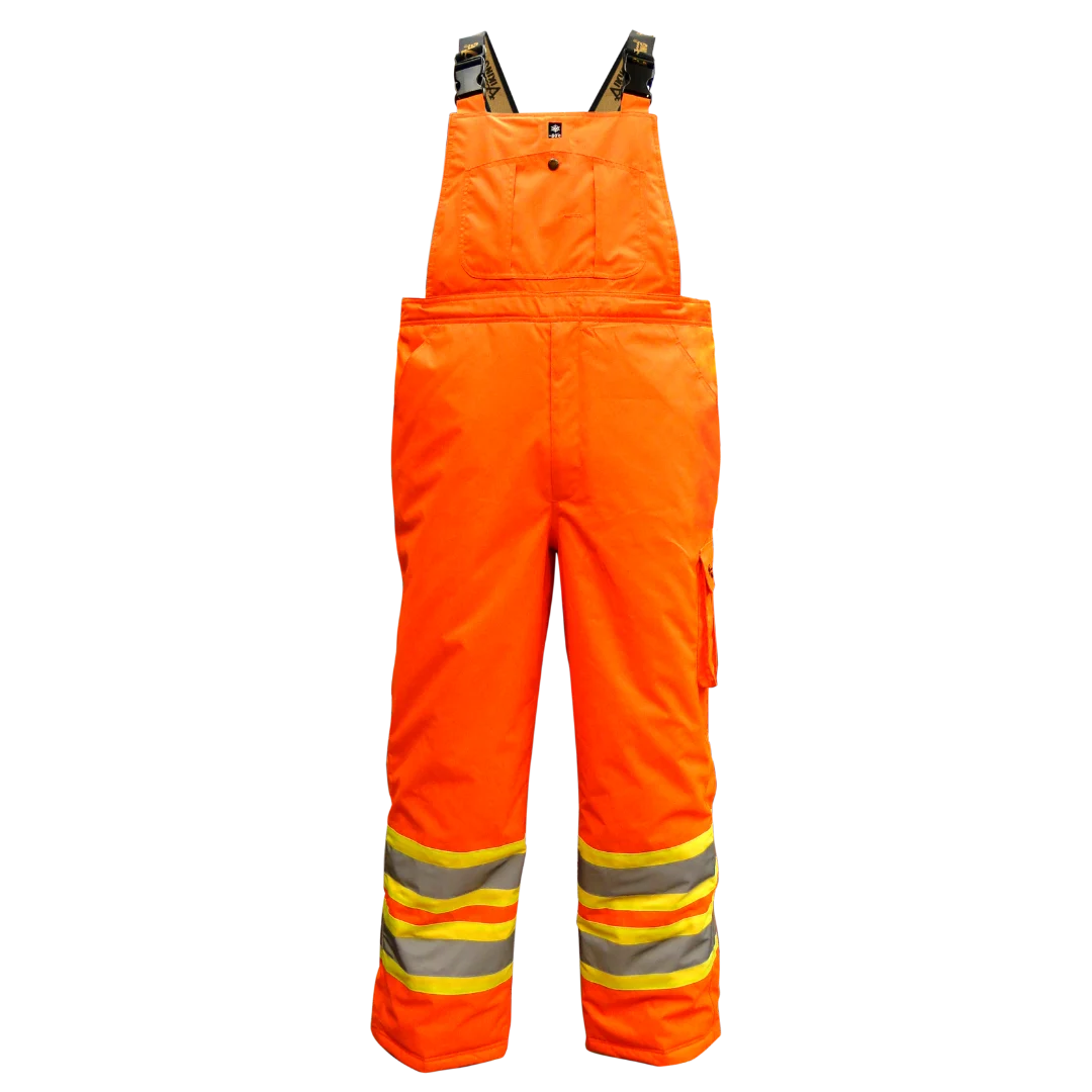 Fully compliant with CSA Z96-09 Class 2, Level 2 and becomes Class 3 in combination with right model arm and leg bands. Fully compliant with ANSI/ISEA 107-2010 Class 3 Level 2 on the jacket ; Class E, Level 2 on the pants. 2" Vi-Brance® reflective material in 4" contrasting tape meets WCB/Worksafe/DOT configuration. 250 GSM ThemoMaxx® Insulation good up to -500C/ -600F. Heavy duty 300 Denier Trilobal Rip-Stop polyester with PU backing gives superior abrasion, puncture,rip and snag resistance. Heavy duty elastic suspenders with quick release buckle. Insulated front & back upper bib Inner zippered pocket and front storage pocket on bib. 2 side waist gussets for wind guard 2 front slash pockets. Zippered fly and velcro flap. Left side cargo pocket. 18" heavy duty boot zipper with 7" internal kick panel .